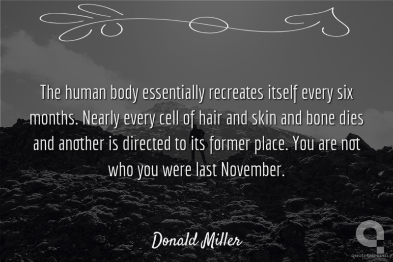 The human body essentially recreates itself every six months. Nearly every cell of hair and skin and bone dies and another is directed to its former place. You are not who you were last November.
