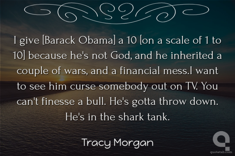 I give [Barack Obama] a 10 [on a scale of 1 to 10] because he's not God, and he inherited a couple of wars, and a financial mess.I want to see him curse somebody out on TV. You can't finesse a bull. He's gotta throw down. He's in the shark tank.