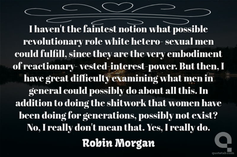 I haven't the faintest notion what possible revolutionary role white hetero- sexual men could fulfill, since they are the very embodiment of reactionary- vested-interest-power. But then, I have great difficulty examining what men in general could possibly do about all this. In addition to doing the shitwork that women have been doing for generations, possibly not exist? No, I really don't mean that. Yes, I really do.