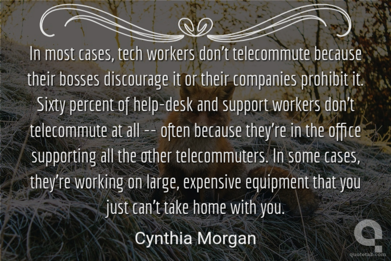 In most cases, tech workers don't telecommute because their bosses discourage it or their companies prohibit it. Sixty percent of help-desk and support workers don't telecommute at all -- often because they're in the office supporting all the other telecommuters. In some cases, they're working on large, expensive equipment that you just can't take home with you.