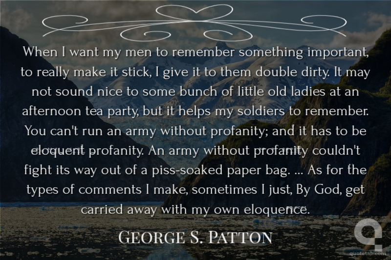 When I want my men to remember something important, to really make it stick, I give it to them double dirty. It may not sound nice to some bunch of little old ladies at an afternoon tea party, but it helps my soldiers to remember. You can't run an army without profanity; and it has to be eloquent profanity. An army without profanity couldn't fight its way out of a piss-soaked paper bag. ... As for the types of comments I make, sometimes I just, By God, get carried away with my own eloquence.