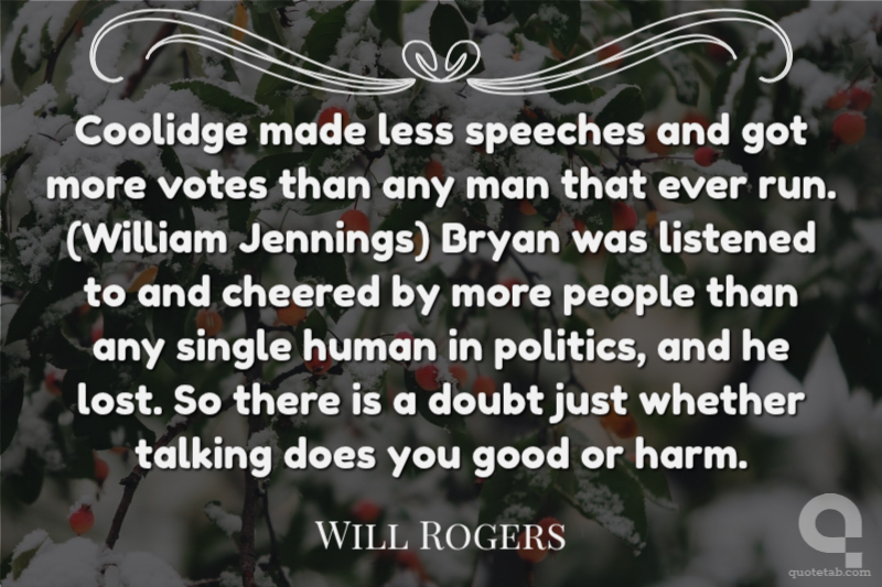 Coolidge made less speeches and got more votes than any man that ever run. (William Jennings) Bryan was listened to and cheered by more people than any single human in politics, and he lost. So there is a doubt just whether talking does you good or harm.
