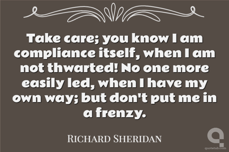 Take care; you know I am compliance itself, when I am not thwarted! No one more easily led, when I have my own way; but don't put me in a frenzy.