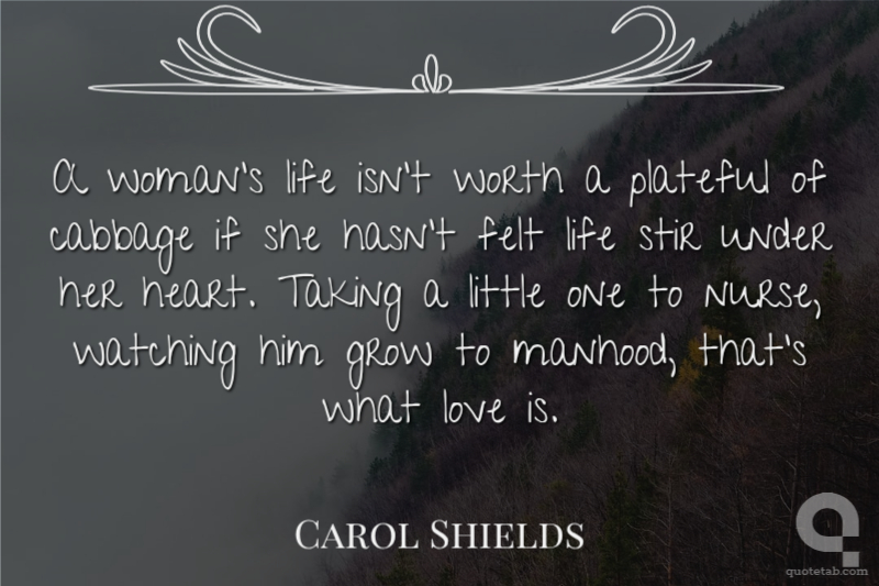 A woman's life isn't worth a plateful of cabbage if she hasn't felt life stir under her heart. Taking a little one to nurse, watching him grow to manhood, that's what love is.