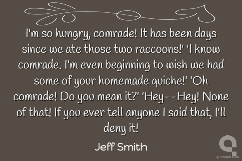 I'm so hungry, comrade! It has been days since we ate those two raccoons!' 'I know comrade. I'm even beginning to wish we had some of your homemade quiche!' 'Oh comrade! Do you mean it?' 'Hey--Hey! None of that! If you ever tell anyone I said that, I'll deny it!