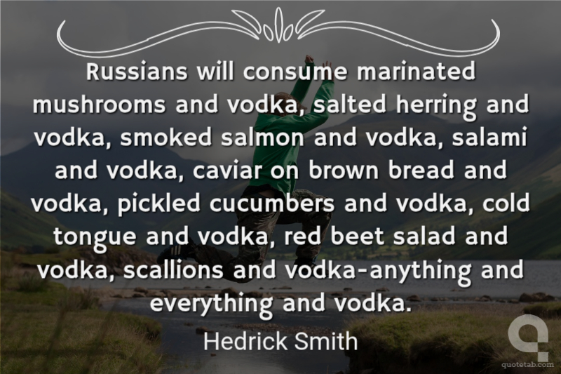 Russians will consume marinated mushrooms and vodka, salted herring and vodka, smoked salmon and vodka, salami and vodka, caviar on brown bread and vodka, pickled cucumbers and vodka, cold tongue and vodka, red beet salad and vodka, scallions and vodka-anything and everything and vodka.