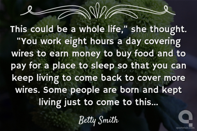 This could be a whole life," she thought. "You work eight hours a day covering wires to earn money to buy food and to pay for a place to sleep so that you can keep living to come back to cover more wires. Some people are born and kept living just to come to this...