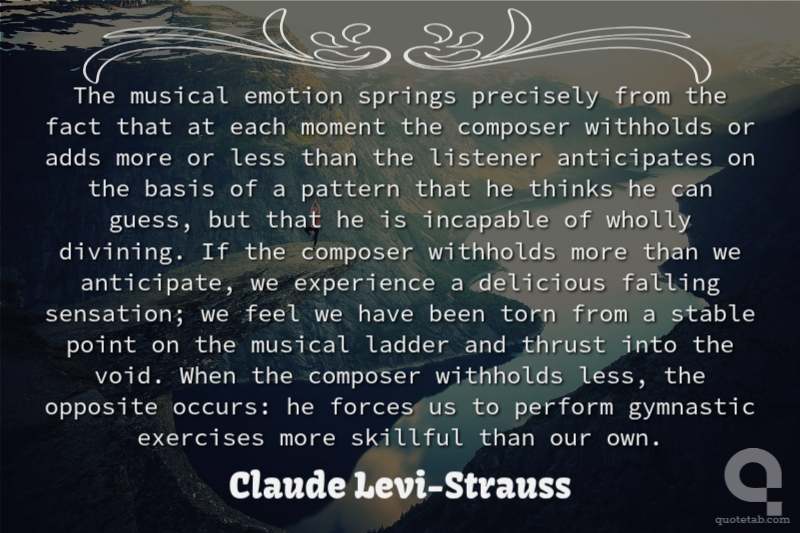 The musical emotion springs precisely from the fact that at each moment the composer withholds or adds more or less than the listener anticipates on the basis of a pattern that he thinks he can guess, but that he is incapable of wholly divining. If the composer withholds more than we anticipate, we experience a delicious falling sensation; we feel we have been torn from a stable point on the musical ladder and thrust into the void. When the composer withholds less, the opposite occurs: he forces us to perform gymnastic exercises more skillful than our own.