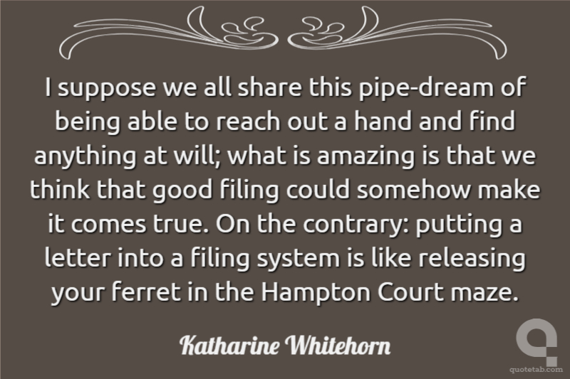 I suppose we all share this pipe-dream of being able to reach out a hand and find anything at will; what is amazing is that we think that good filing could somehow make it comes true. On the contrary: putting a letter into a filing system is like releasing your ferret in the Hampton Court maze.