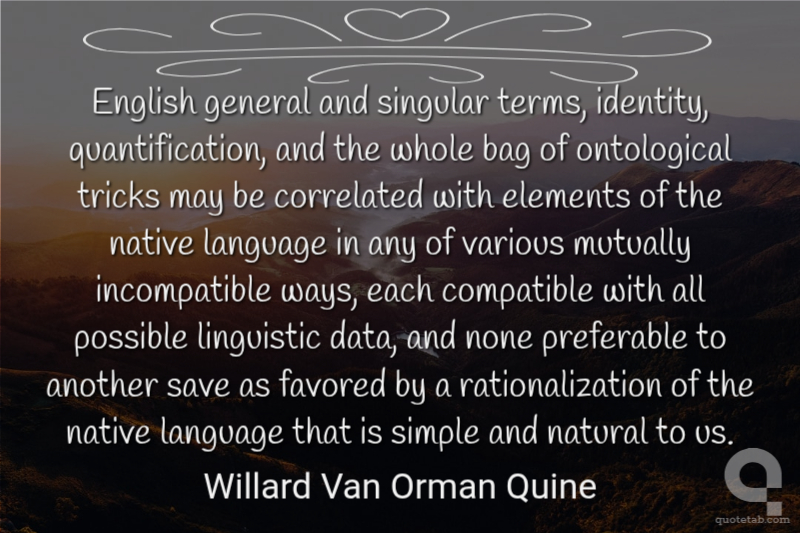 English general and singular terms, identity, quantification, and the whole bag of ontological tricks may be correlated with elements of the native language in any of various mutually incompatible ways, each compatible with all possible linguistic data, and none preferable to another save as favored by a rationalization of the native language that is simple and natural to us.
