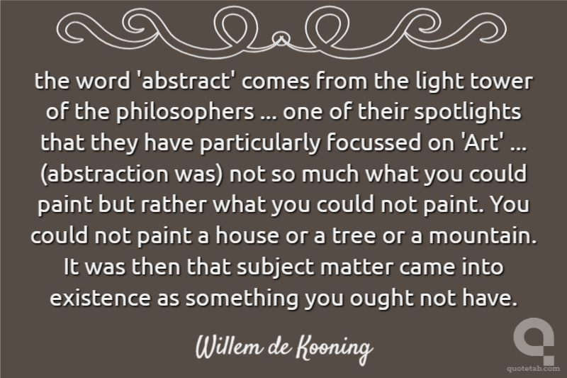 the word 'abstract' comes from the light tower of the philosophers ... one of their spotlights that they have particularly focussed on 'Art' ... (abstraction was) not so much what you could paint but rather what you could not paint. You could not paint a house or a tree or a mountain. It was then that subject matter came into existence as something you ought not have.