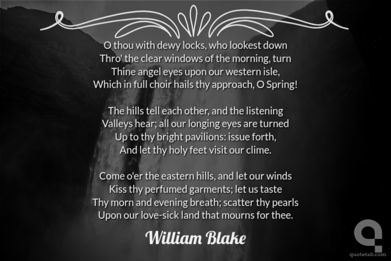 O thou with dewy locks, who lookest down Thro' the clear windows of the morning, turn Thine angel eyes upon our western isle, Which in full choir hails thy approach, O Spring! The hills tell each other, and the listening Valleys hear; all our longing eyes are turned Up to thy bright pavilions: issue forth, And let thy holy feet visit our clime. Come o'er the eastern hills, and let our winds Kiss thy perfumed garments; let us taste Thy morn and evening breath; scatter thy pearls Upon our love-sick land that mourns for thee.