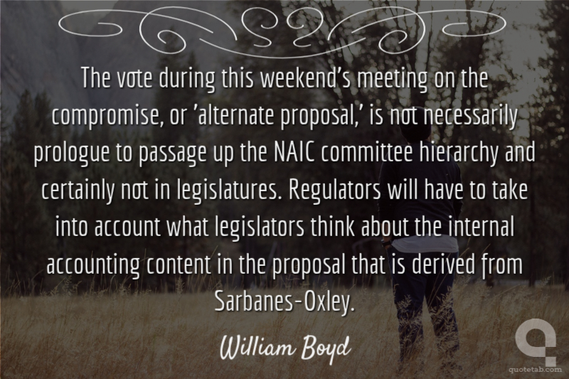 The vote during this weekend's meeting on the compromise, or 'alternate proposal,' is not necessarily prologue to passage up the NAIC committee hierarchy and certainly not in legislatures. Regulators will have to take into account what legislators think about the internal accounting content in the proposal that is derived from Sarbanes-Oxley.