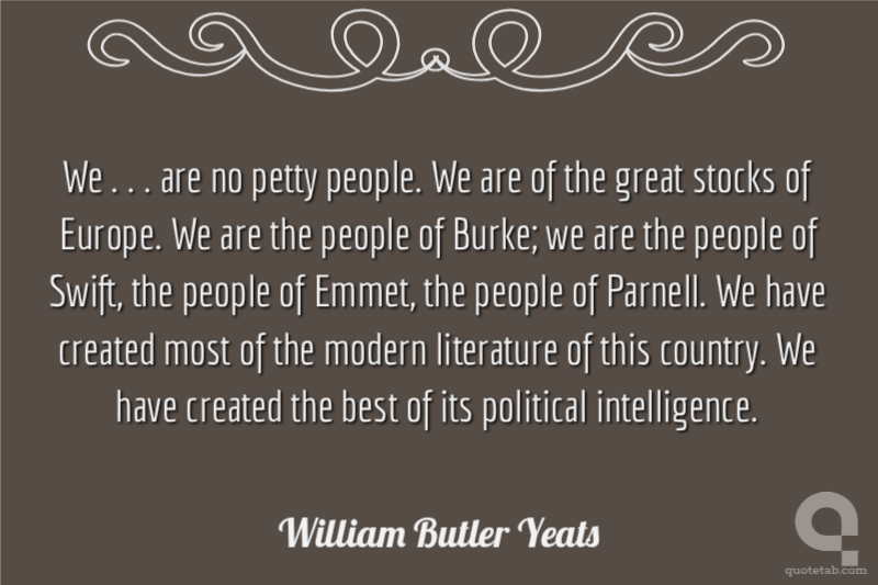 We . . . are no petty people. We are of the great stocks of Europe. We are the people of Burke; we are the people of Swift, the people of Emmet, the people of Parnell. We have created most of the modern literature of this country. We have created the best of its political intelligence.