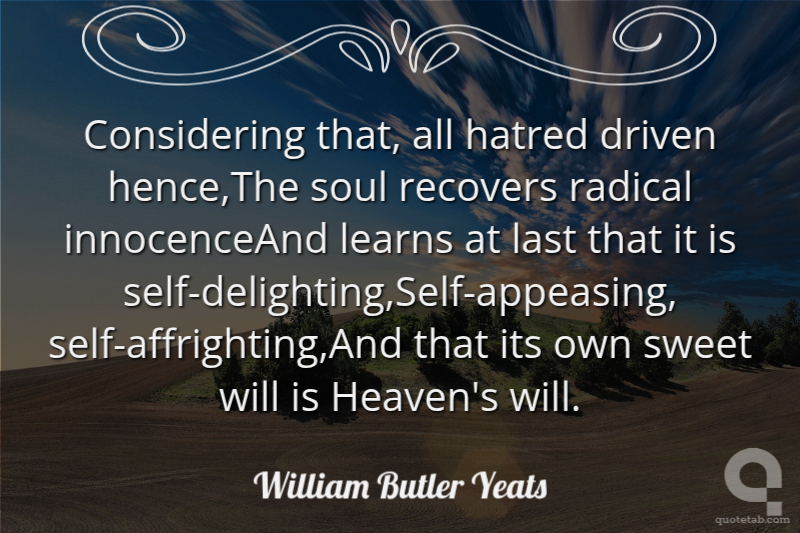 Considering that, all hatred driven hence,The soul recovers radical innocenceAnd learns at last that it is self-delighting,Self-appeasing, self-affrighting,And that its own sweet will is Heaven's will.