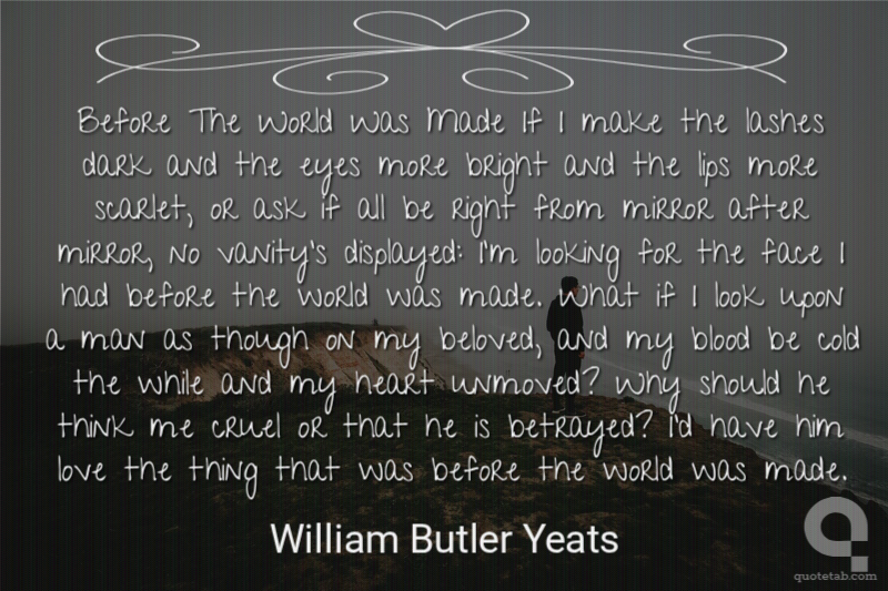 Before The World Was Made If I make the lashes dark and the eyes more bright and the lips more scarlet, or ask if all be right from mirror after mirror, no vanity's displayed: I'm looking for the face I had before the world was made. What if I look upon a man as though on my beloved, and my blood be cold the while and my heart unmoved? Why should he think me cruel or that he is betrayed? I'd have him love the thing that was before the world was made.