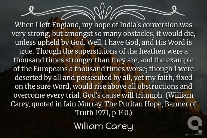 When I left England, my hope of India's conversion was very strong; but amongst so many obstacles, it would die, unless upheld by God. Well, I have God, and His Word is true. Though the superstitions of the heathen were a thousand times stronger than they are, and the example of the Europeans a thousand times worse; though I were deserted by all and persecuted by all, yet my faith, fixed on the sure Word, would rise above all obstructions and overcome every trial. God's cause will triumph. (William Carey, quoted in Iain Murray, The Puritan Hope, Banner of Truth 1971, p 140.)