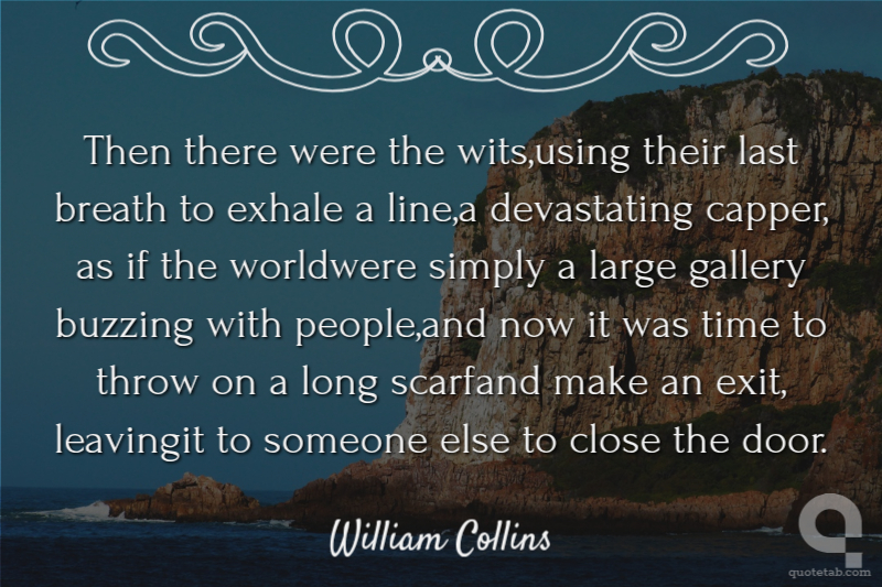 Then there were the wits,using their last breath to exhale a line,a devastating capper, as if the worldwere simply a large gallery buzzing with people,and now it was time to throw on a long scarfand make an exit, leavingit to someone else to close the door.