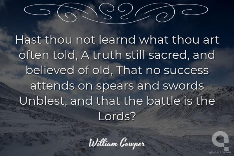 Hast thou not learnd what thou art often told, A truth still sacred, and believed of old, That no success attends on spears and swords Unblest, and that the battle is the Lords?