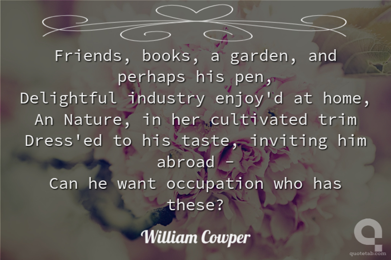 Friends, books, a garden, and perhaps his pen, Delightful industry enjoy'd at home, An Nature, in her cultivated trim Dress'ed to his taste, inviting him abroad - Can he want occupation who has these?