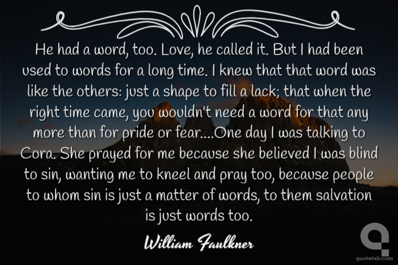 He had a word, too. Love, he called it. But I had been used to words for a long time. I knew that that word was like the others: just a shape to fill a lack; that when the right time came, you wouldn't need a word for that any more than for pride or fear....One day I was talking to Cora. She prayed for me because she believed I was blind to sin, wanting me to kneel and pray too, because people to whom sin is just a matter of words, to them salvation is just words too.