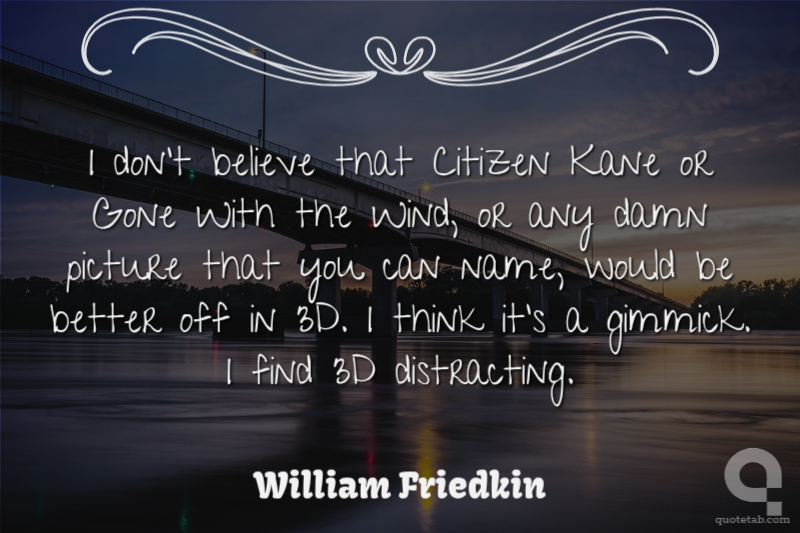 I don't believe that Citizen Kane or Gone With the Wind, or any damn picture that you can name, would be better off in 3D. I think it's a gimmick. I find 3D distracting.