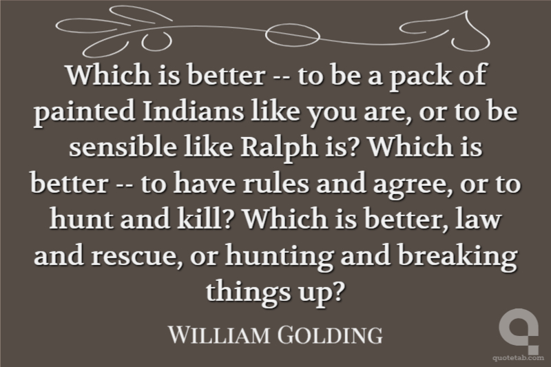 Which is better -- to be a pack of painted Indians like you are, or to be sensible like Ralph is? Which is better -- to have rules and agree, or to hunt and kill? Which is better, law and rescue, or hunting and breaking things up?