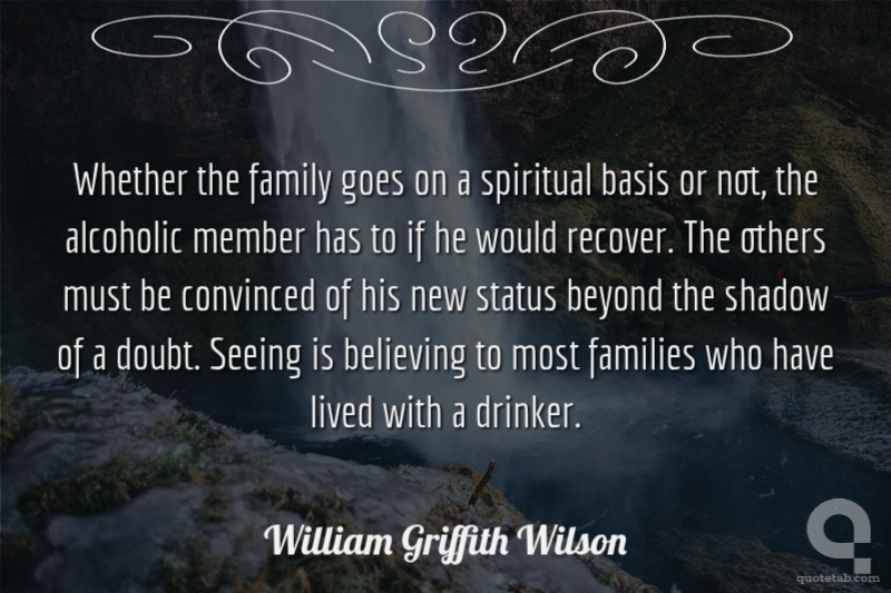 Whether the family goes on a spiritual basis or not, the alcoholic member has to if he would recover. The others must be convinced of his new status beyond the shadow of a doubt. Seeing is believing to most families who have lived with a drinker.