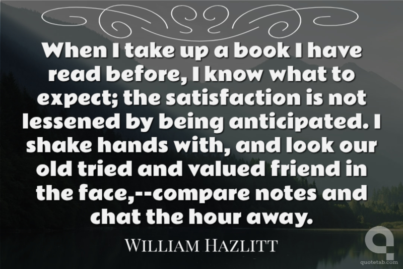 When I take up a book I have read before, I know what to expect; the satisfaction is not lessened by being anticipated. I shake hands with, and look our old tried and valued friend in the face,--compare notes and chat the hour away.