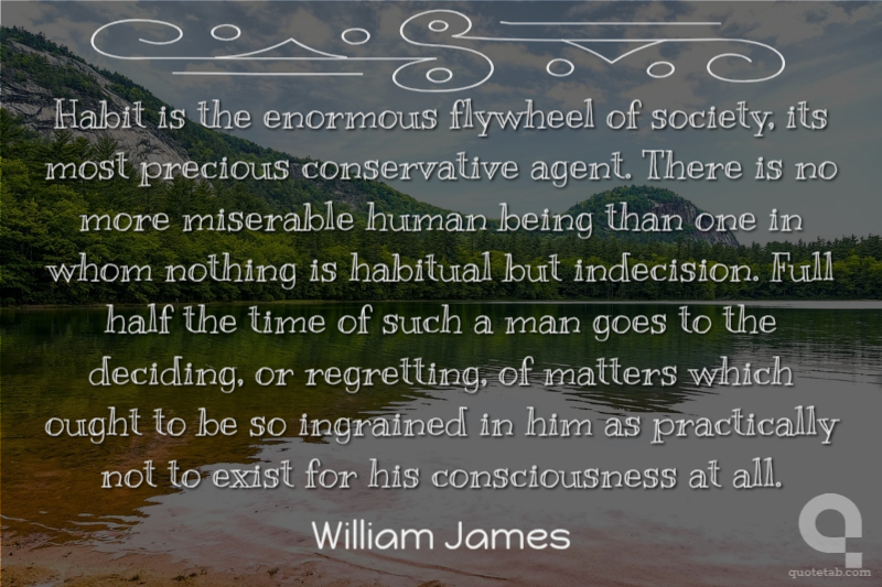 Habit is the enormous flywheel of society, its most precious conservative agent. There is no more miserable human being than one in whom nothing is habitual but indecision. Full half the time of such a man goes to the deciding, or regretting, of matters which ought to be so ingrained in him as practically not to exist for his consciousness at all.