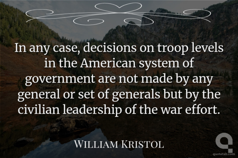 In any case, decisions on troop levels in the American system of government are not made by any general or set of generals but by the civilian leadership of the war effort.