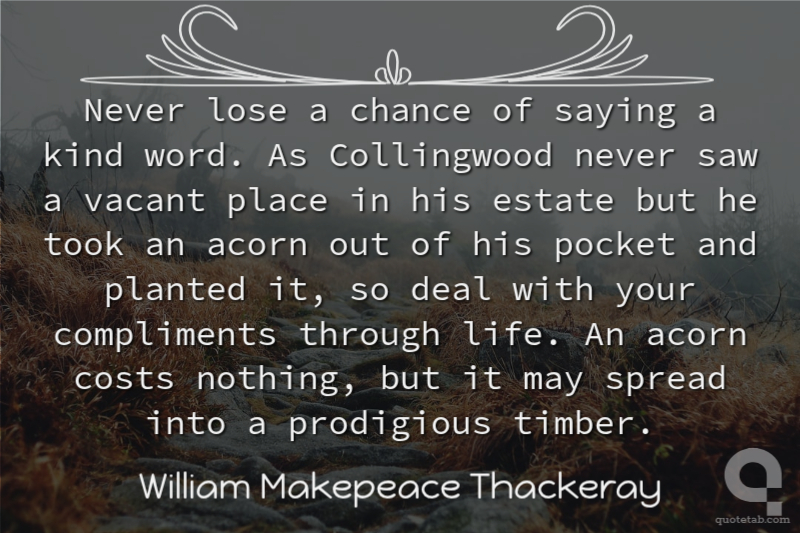 Never lose a chance of saying a kind word. As Collingwood never saw a vacant place in his estate but he took an acorn out of his pocket and planted it, so deal with your compliments through life. An acorn costs nothing, but it may spread into a prodigious timber.