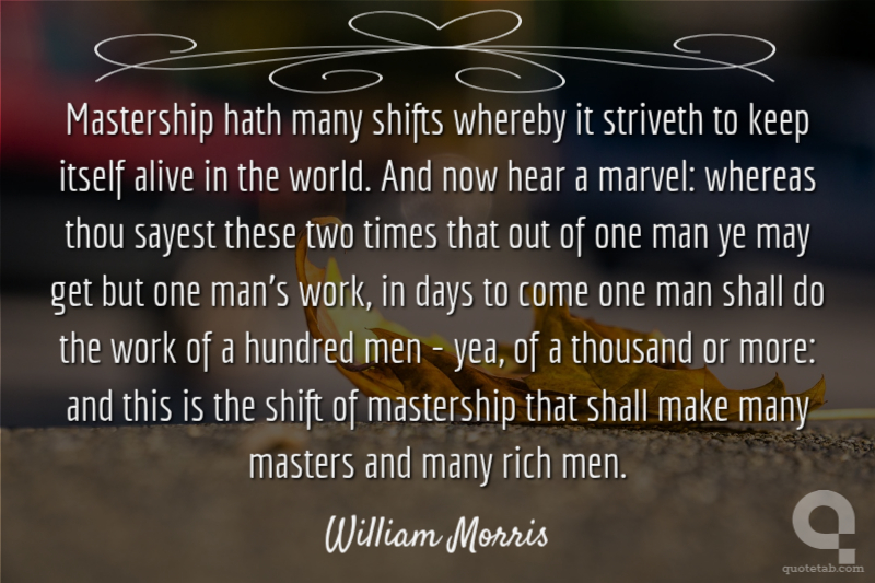 Mastership hath many shifts whereby it striveth to keep itself alive in the world. And now hear a marvel: whereas thou sayest these two times that out of one man ye may get but one man's work, in days to come one man shall do the work of a hundred men - yea, of a thousand or more: and this is the shift of mastership that shall make many masters and many rich men.