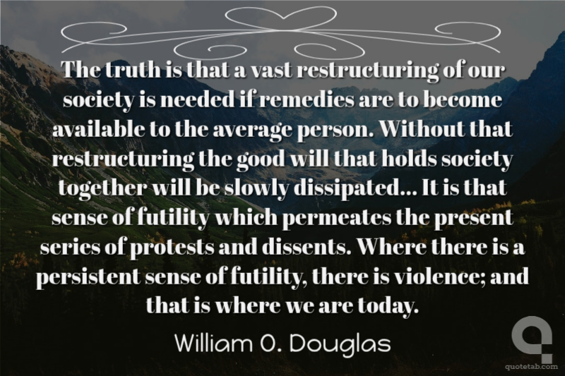 The truth is that a vast restructuring of our society is needed if remedies are to become available to the average person. Without that restructuring the good will that holds society together will be slowly dissipated... It is that sense of futility which permeates the present series of protests and dissents. Where there is a persistent sense of futility, there is violence; and that is where we are today.