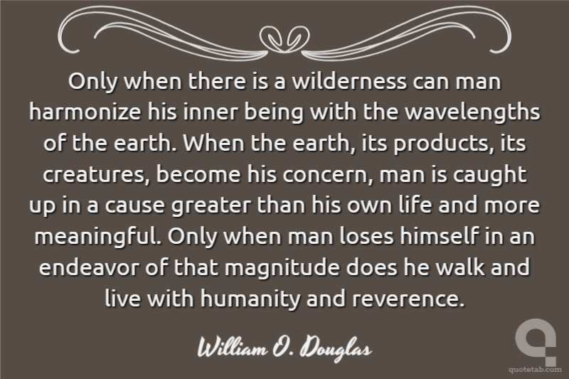 Only when there is a wilderness can man harmonize his inner being with the wavelengths of the earth. When the earth, its products, its creatures, become his concern, man is caught up in a cause greater than his own life and more meaningful. Only when man loses himself in an endeavor of that magnitude does he walk and live with humanity and reverence.