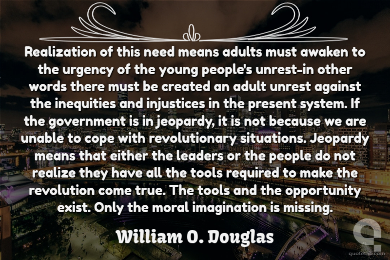 Realization of this need means adults must awaken to the urgency of the young people's unrest-in other words there must be created an adult unrest against the inequities and injustices in the present system. If the government is in jeopardy, it is not because we are unable to cope with revolutionary situations. Jeopardy means that either the leaders or the people do not realize they have all the tools required to make the revolution come true. The tools and the opportunity exist. Only the moral imagination is missing.