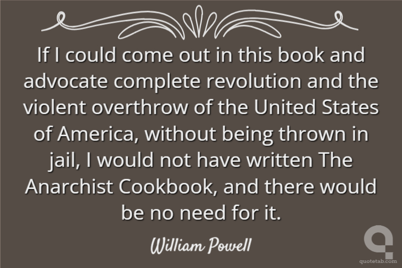 If I could come out in this book and advocate complete revolution and the violent overthrow of the United States of America, without being thrown in jail, I would not have written The Anarchist Cookbook, and there would be no need for it.