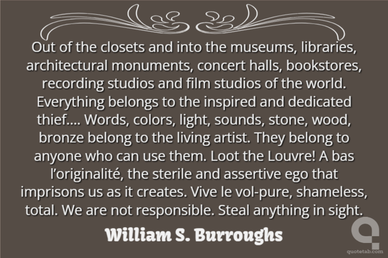 Out of the closets and into the museums, libraries, architectural monuments, concert halls, bookstores, recording studios and film studios of the world. Everything belongs to the inspired and dedicated thief…. Words, colors, light, sounds, stone, wood, bronze belong to the living artist. They belong to anyone who can use them. Loot the Louvre! A bas l’originalité, the sterile and assertive ego that imprisons us as it creates. Vive le vol-pure, shameless, total. We are not responsible. Steal anything in sight.