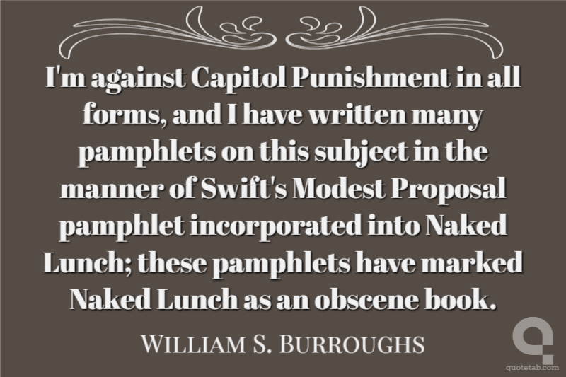 I'm against Capitol Punishment in all forms, and I have written many pamphlets on this subject in the manner of Swift's Modest Proposal pamphlet incorporated into Naked Lunch; these pamphlets have marked Naked Lunch as an obscene book.