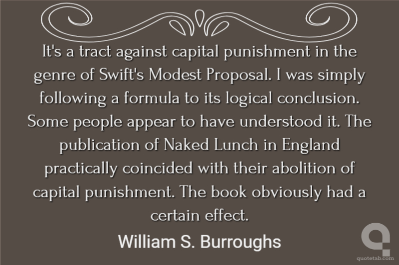 It's a tract against capital punishment in the genre of Swift's Modest Proposal. I was simply following a formula to its logical conclusion. Some people appear to have understood it. The publication of Naked Lunch in England practically coincided with their abolition of capital punishment. The book obviously had a certain effect.
