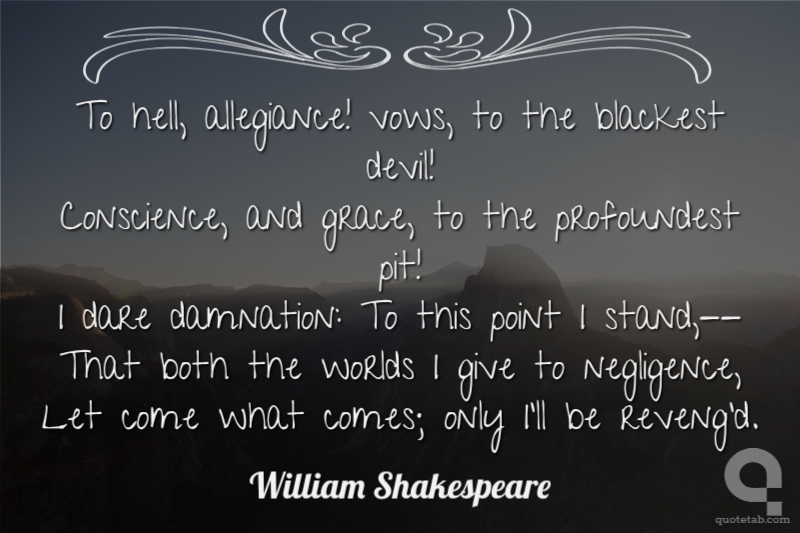 To hell, allegiance! vows, to the blackest devil! Conscience, and grace, to the profoundest pit! I dare damnation: To this point I stand,-- That both the worlds I give to negligence, Let come what comes; only I'll be reveng'd.