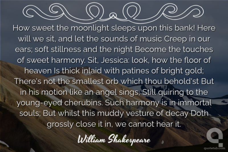 How sweet the moonlight sleeps upon this bank! Here will we sit, and let the sounds of music Creep in our ears; soft stillness and the night Become the touches of sweet harmony. Sit, Jessica: look, how the floor of heaven Is thick inlaid with patines of bright gold; There's not the smallest orb which thou behold'st But in his motion like an angel sings, Still quiring to the young-eyed cherubins. Such harmony is in immortal souls; But whilst this muddy vesture of decay Doth grossly close it in, we cannot hear it.