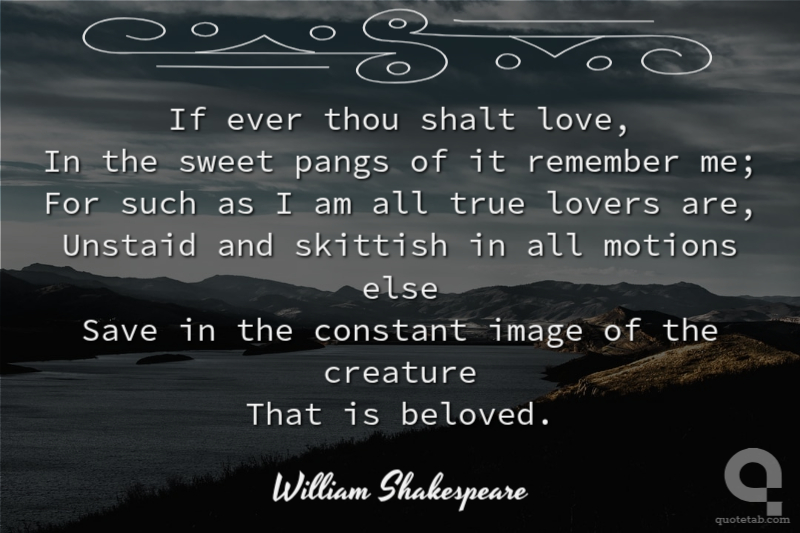 If ever thou shalt love, In the sweet pangs of it remember me; For such as I am all true lovers are, Unstaid and skittish in all motions else Save in the constant image of the creature That is beloved.
