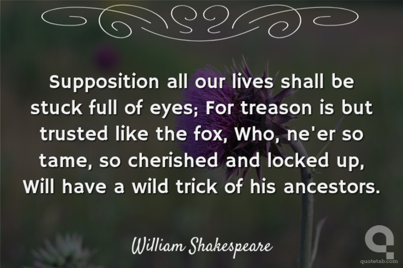 Supposition all our lives shall be stuck full of eyes; For treason is but trusted like the fox, Who, ne'er so tame, so cherished and locked up, Will have a wild trick of his ancestors.