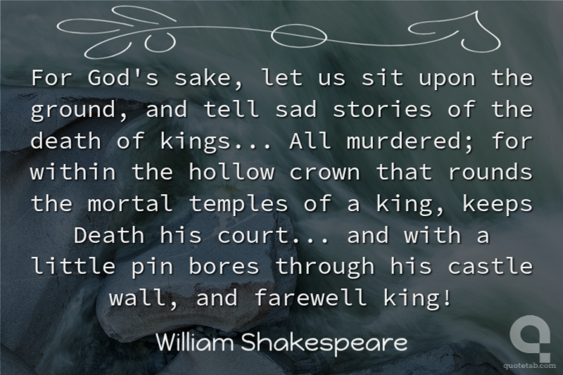 For God's sake, let us sit upon the ground, and tell sad stories of the death of kings... All murdered; for within the hollow crown that rounds the mortal temples of a king, keeps Death his court... and with a little pin bores through his castle wall, and farewell king!