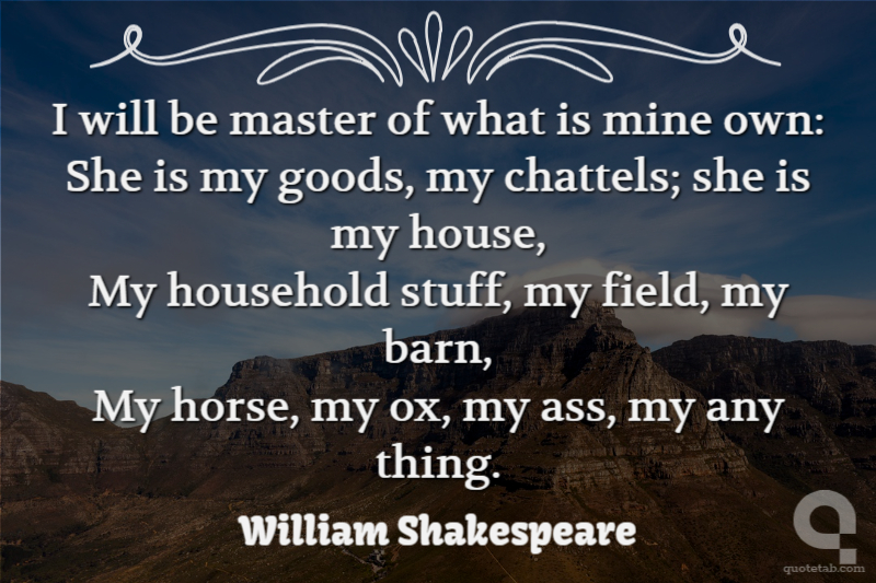 I will be master of what is mine own: She is my goods, my chattels; she is my house, My household stuff, my field, my barn, My horse, my ox, my ass, my any thing.