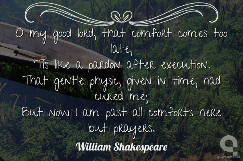 O my good lord, that comfort comes too late, 'Tis like a pardon after execution. That gentle physic, given in time, had cured me; But now I am past all comforts here but prayers.