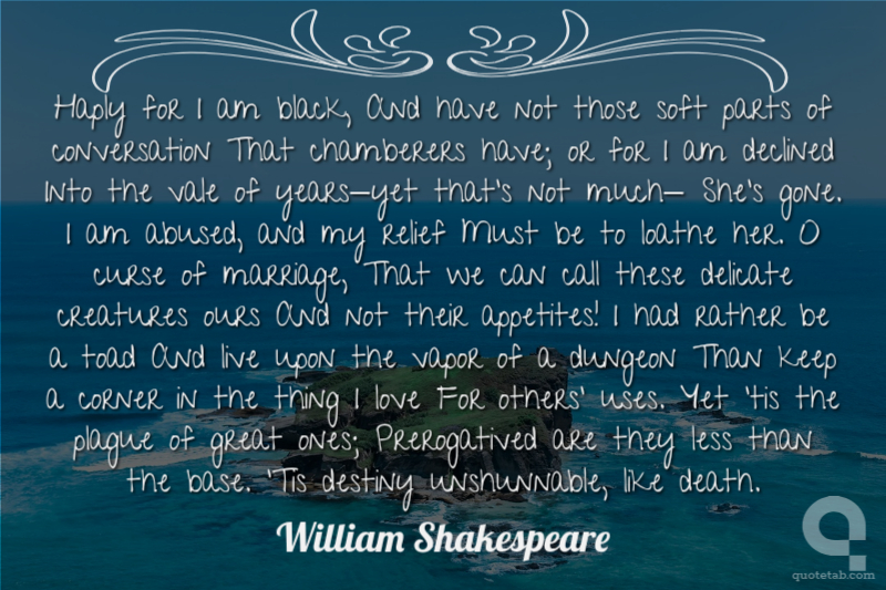 Haply for I am black, And have not those soft parts of conversation That chamberers have; or for I am declined Into the vale of years—yet that’s not much— She’s gone. I am abused, and my relief Must be to loathe her. O curse of marriage, That we can call these delicate creatures ours And not their appetites! I had rather be a toad And live upon the vapor of a dungeon Than keep a corner in the thing I love For others’ uses. Yet ’tis the plague of great ones; Prerogatived are they less than the base. ’Tis destiny unshunnable, like death.
