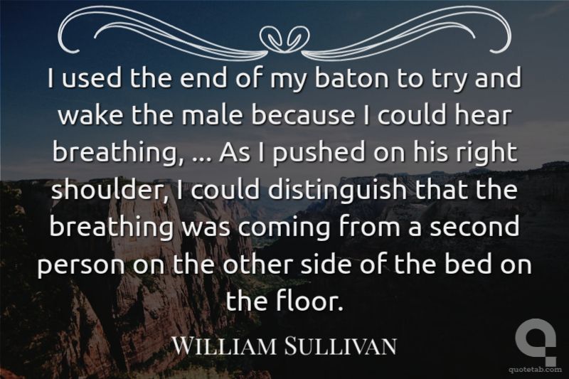 I used the end of my baton to try and wake the male because I could hear breathing, ... As I pushed on his right shoulder, I could distinguish that the breathing was coming from a second person on the other side of the bed on the floor.