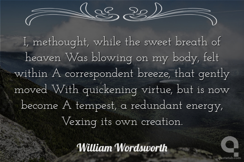 I, methought, while the sweet breath of heaven Was blowing on my body, felt within A correspondent breeze, that gently moved With quickening virtue, but is now become A tempest, a redundant energy, Vexing its own creation.